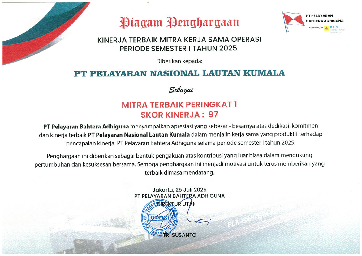 Recognized for our excellence, we received the Certificate of Merit "Best Performance of Operational Cooperation Pertners for The First Semester of 2025" from PT Pelayaran Bahtera Adhiguna (one of the subsidiaries of PT PLN Energy Primer Indonesia). This certificate validates our commitment to punctuality and superior service within the national energy supply chain.